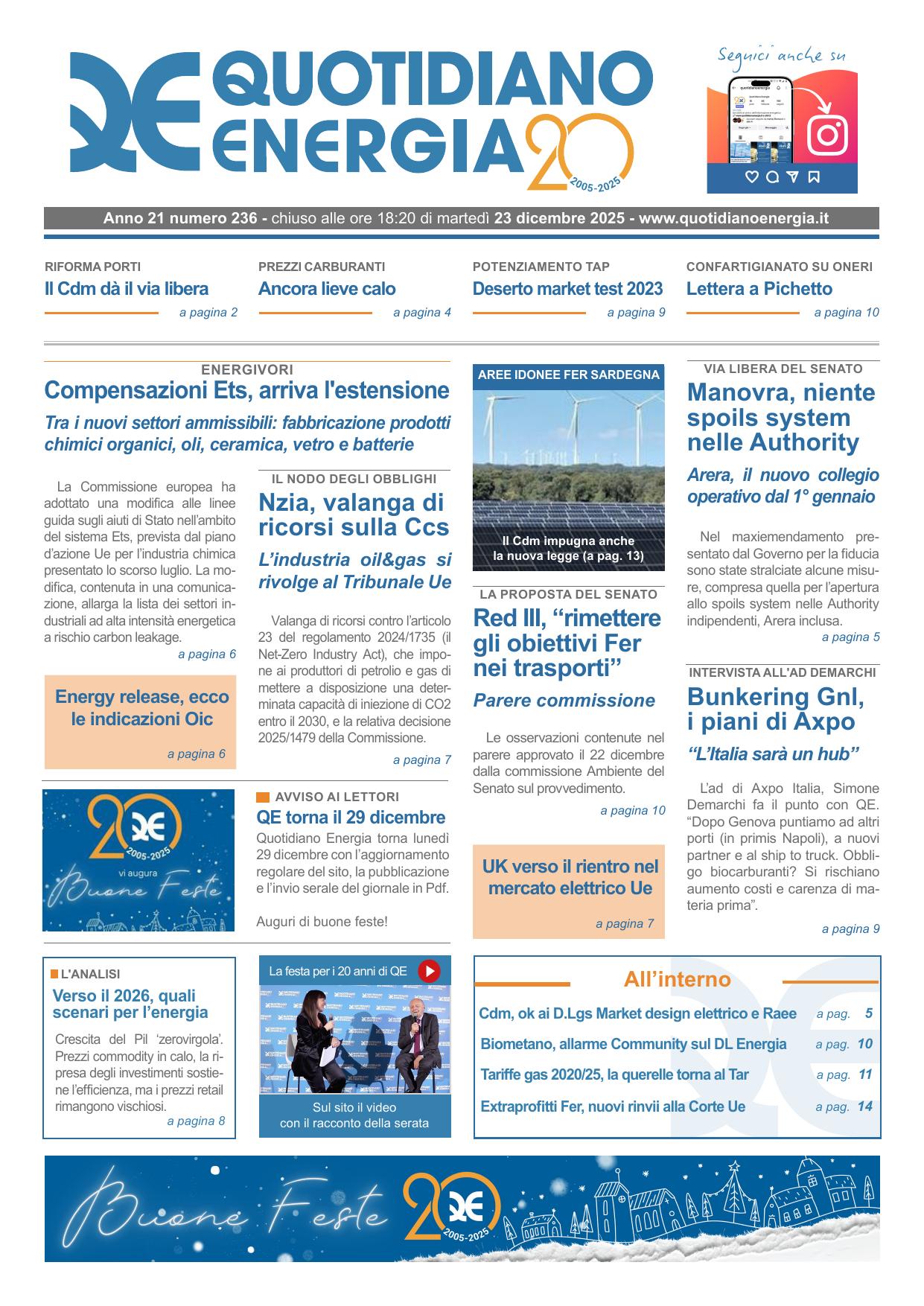 Quotidiano Energia torna lunedì 29 dicembre con l’aggiornamento regolare del sito, la pubblicazione e l’invio serale del giornale in Pdf.
