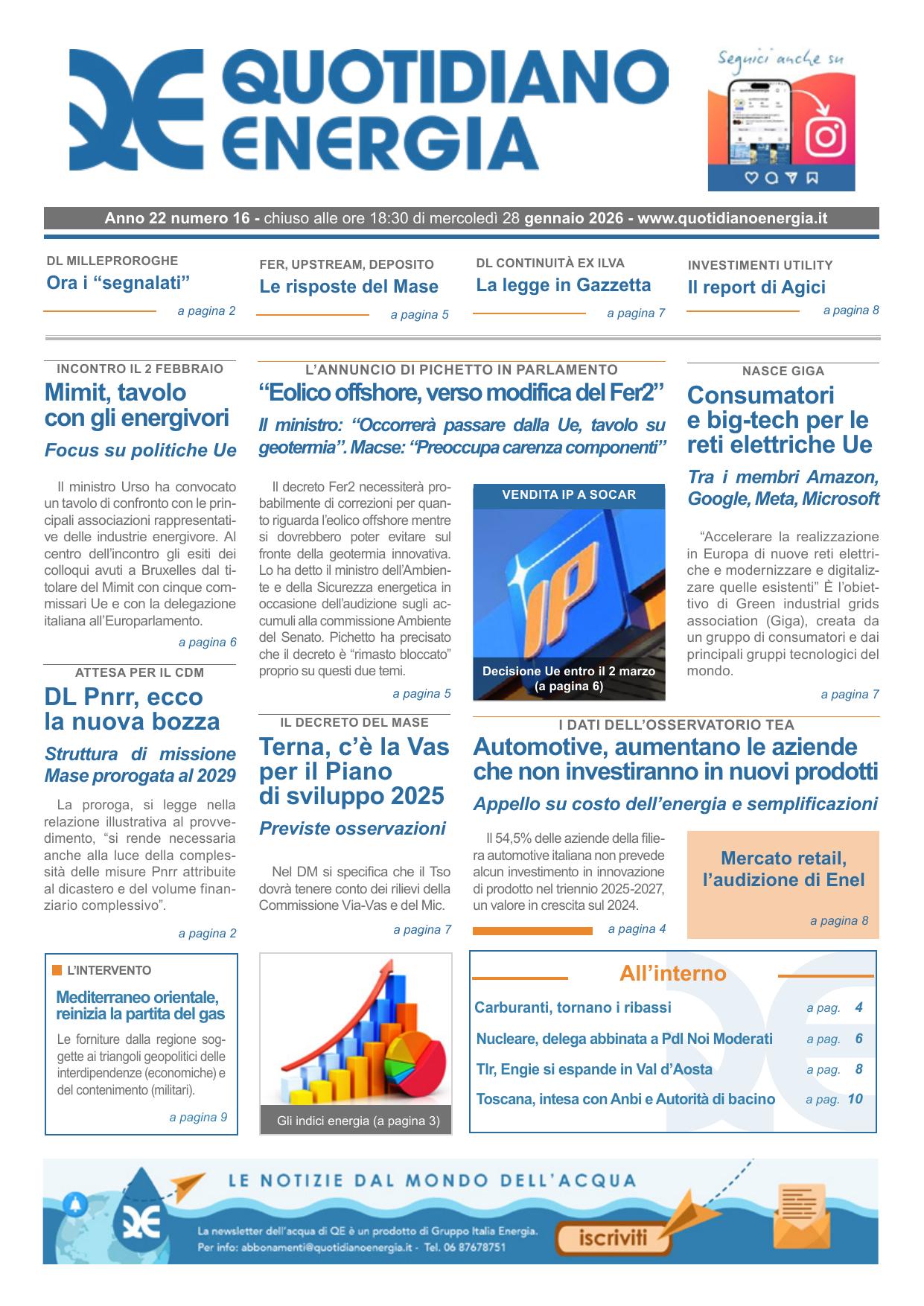 Il Mase ha concesso una proroga di 5 anni, fino al 27 agosto 2030, per la Via al progetto “Metanizzazione della Sardegna - Tratto Sud” di Enura. Il 17 aprile 2025 la jv Snam-Sgi aveva chiesto più tempo in attesa che si definisse il contenzioso sul Dpcm