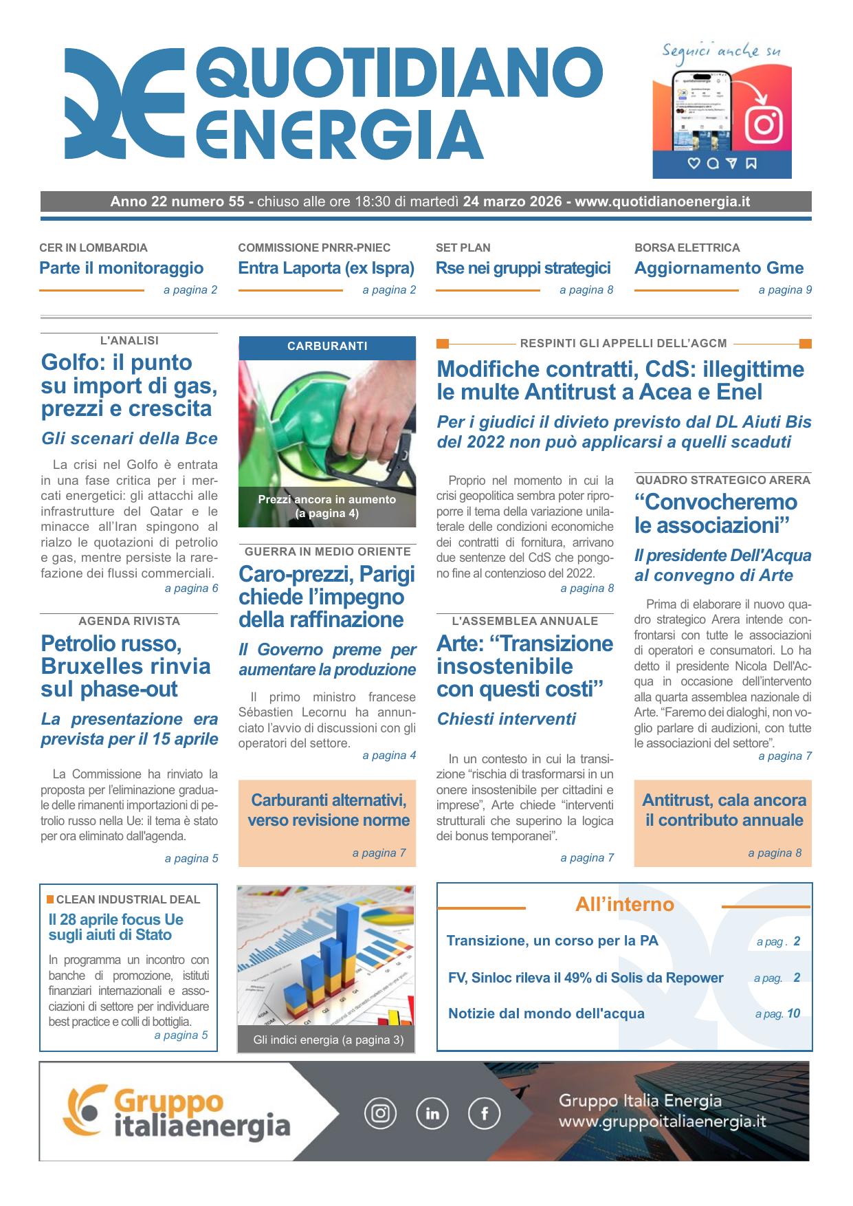 Il Parlamento torna dalla pausa referendaria puntando l’attenzione sull’avvio dei lavori sul DL Carburanti in Senato e sui voti attesi al DL Bollette alla Camera. Montecitorio si occuperà poi di decreto Pnrr, mentre a Palazzo Madama sono in programma audizioni sul DL Infrastrutture e sull’atto Ue Valutazioni ambientali. Mercoledì la presidente Enea Francesca Mariotti è attesa al Copasir. Queste alcune delle segnalazioni