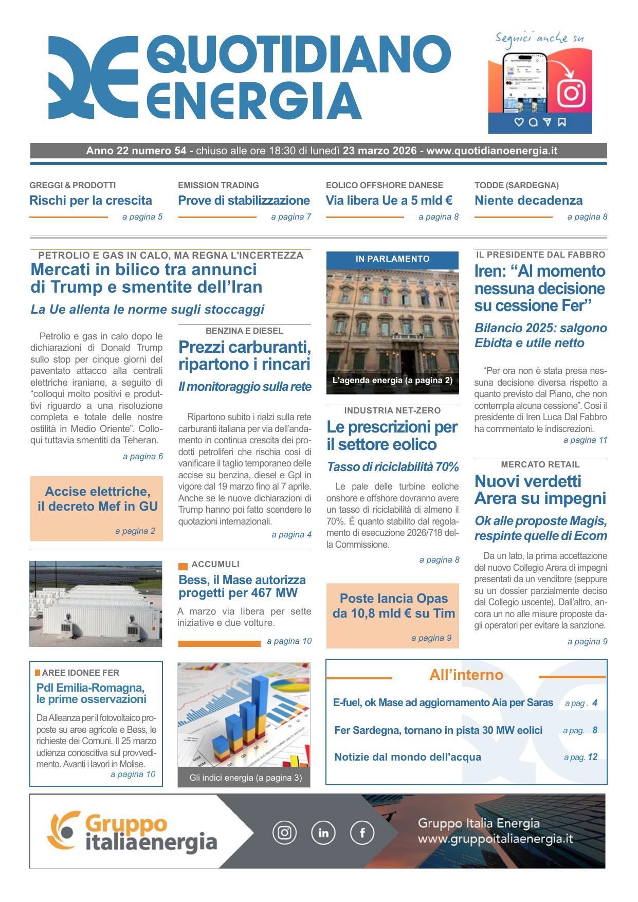 Petrolio e gas in calo dopo le dichiarazioni di Donald Trump sullo stop per cinque giorni del paventato attacco alla centrali elettriche iraniane, a seguito di “colloqui molto positivi e produttivi riguardo a una risoluzione completa e totale delle nostre ostilità in Medio Oriente”. Colloqui tuttavia smentiti da Teheran