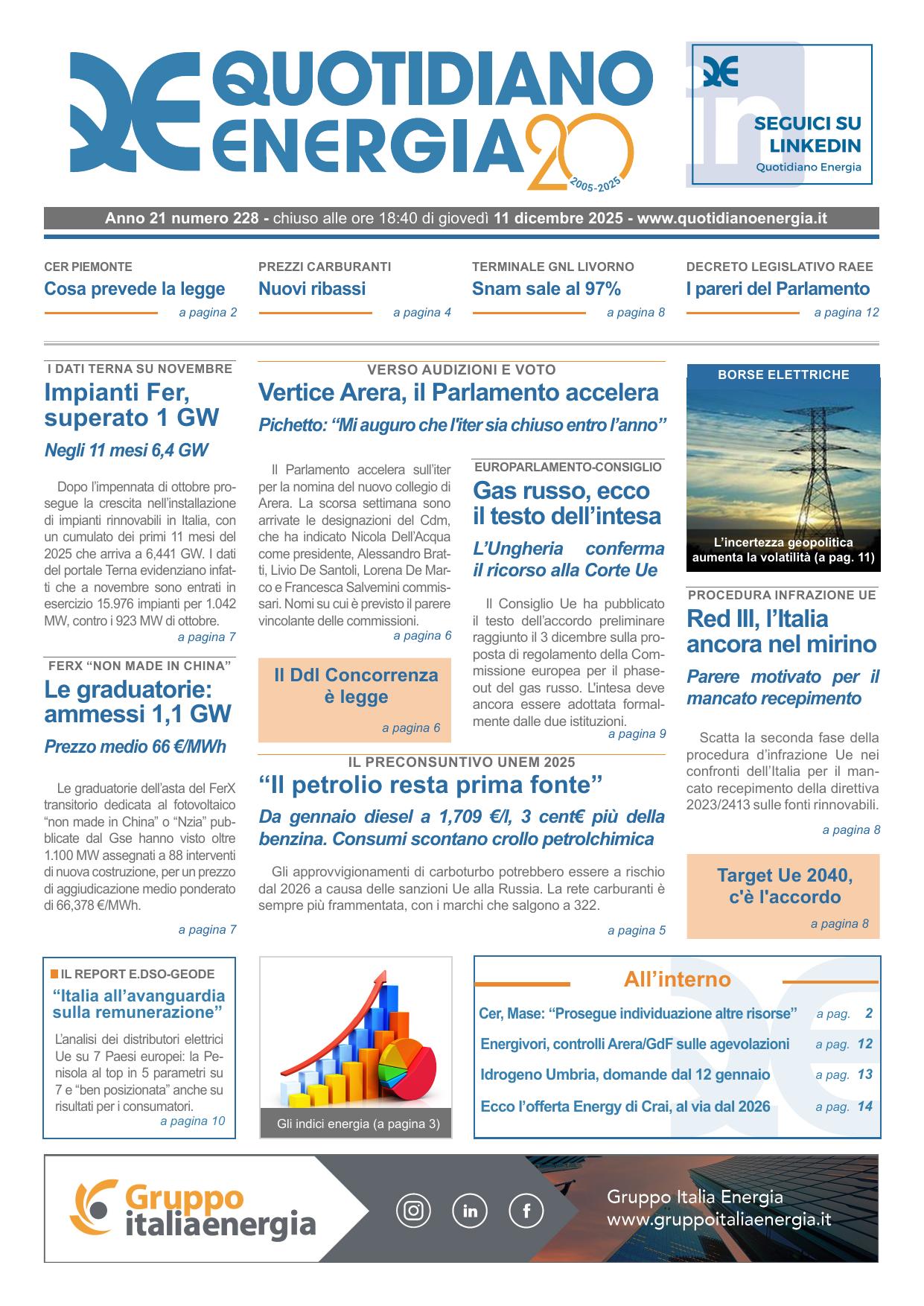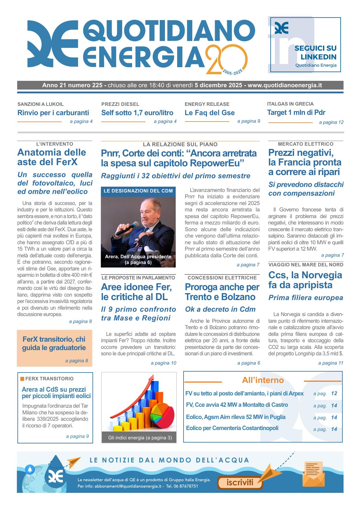 Terna ha assegnato l’intera capacità di 1.786 MW nell’ambito delle aste di importazione virtuale per l’intero 2026 e per il 1° trimestre del prossimo anno. In particolare, dal mercato estero Francia sono stati aggiudicati tutti i 120,4 MW a sette shipper per il periodo 1° gennaio - 31 dicembre e tutti i 1.665,9 MW a 12 shipper per il periodo 1° gennaio - 31 marzo.