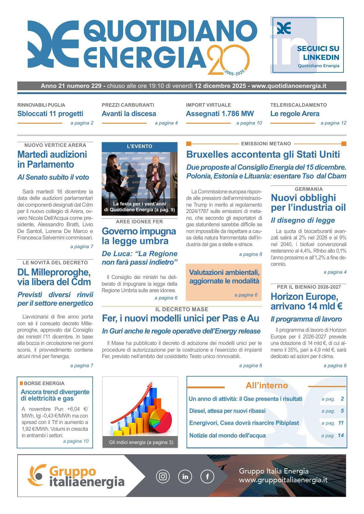 Sarà martedì 16 dicembre la data delle audizioni parlamentari dei componenti designati dal Cdm per il nuovo collegio di Arera, ovvero Nicola Dell’Acqua come presidente, Alessandro Bratti, Livio De Santoli, Lorena De Marco e Francesca Salvemini commissari