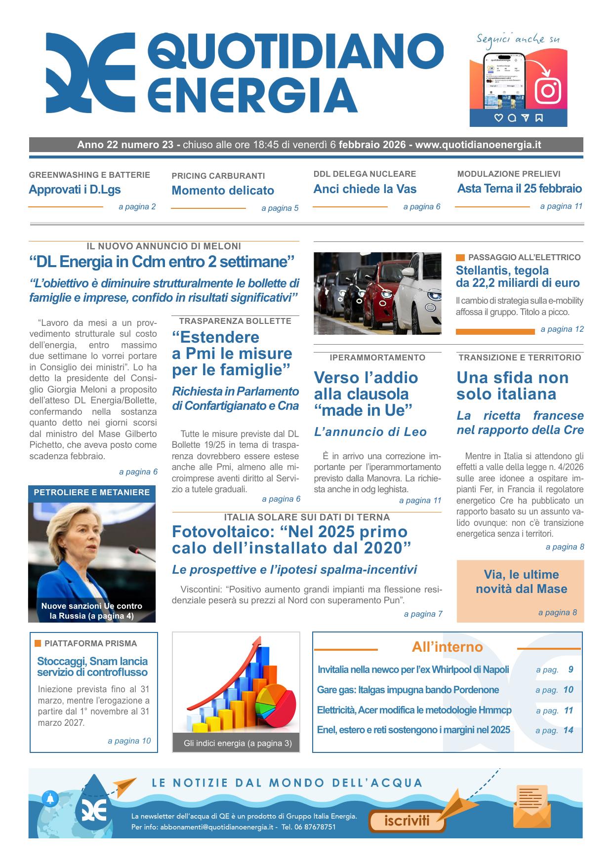 “Lavoro da mesi a un provvedimento strutturale sul costo dell’energia, entro massimo due settimane lo vorrei portare in Consiglio dei ministri”. Lo ha detto la presidente del Consiglio Giorgia Meloni a proposito dell’atteso DL Energia/Bollette, confermando nella sostanza quanto detto nei giorni scorsi dal ministro del Mase Pichetto, che aveva posto come scadenza febbraio