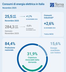 Dopo il dato piatto di ottobre, a novembre tornano in crescita i consumi elettrici italiani. Secondo i dati di Terna, infatti, il fabbisogno è stato pari a 25,5 miliardi di kWh, in aumento dell’1,7% rispetto allo stesso mese dello scorso anno.