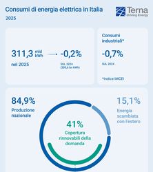 Nel 2025 la produzione record del fotovoltaico (spinta anche dalle nuove installazioni, vedi articolo a parte) non è bastata per evitare un calo del contributo complessivo delle rinnovabili alla copertura della domanda elettrica italiana, sceso al 41% rispetto al 42% del 2024 soprattutto a causa di una produzione idroelettrica tornata a valori standard.
